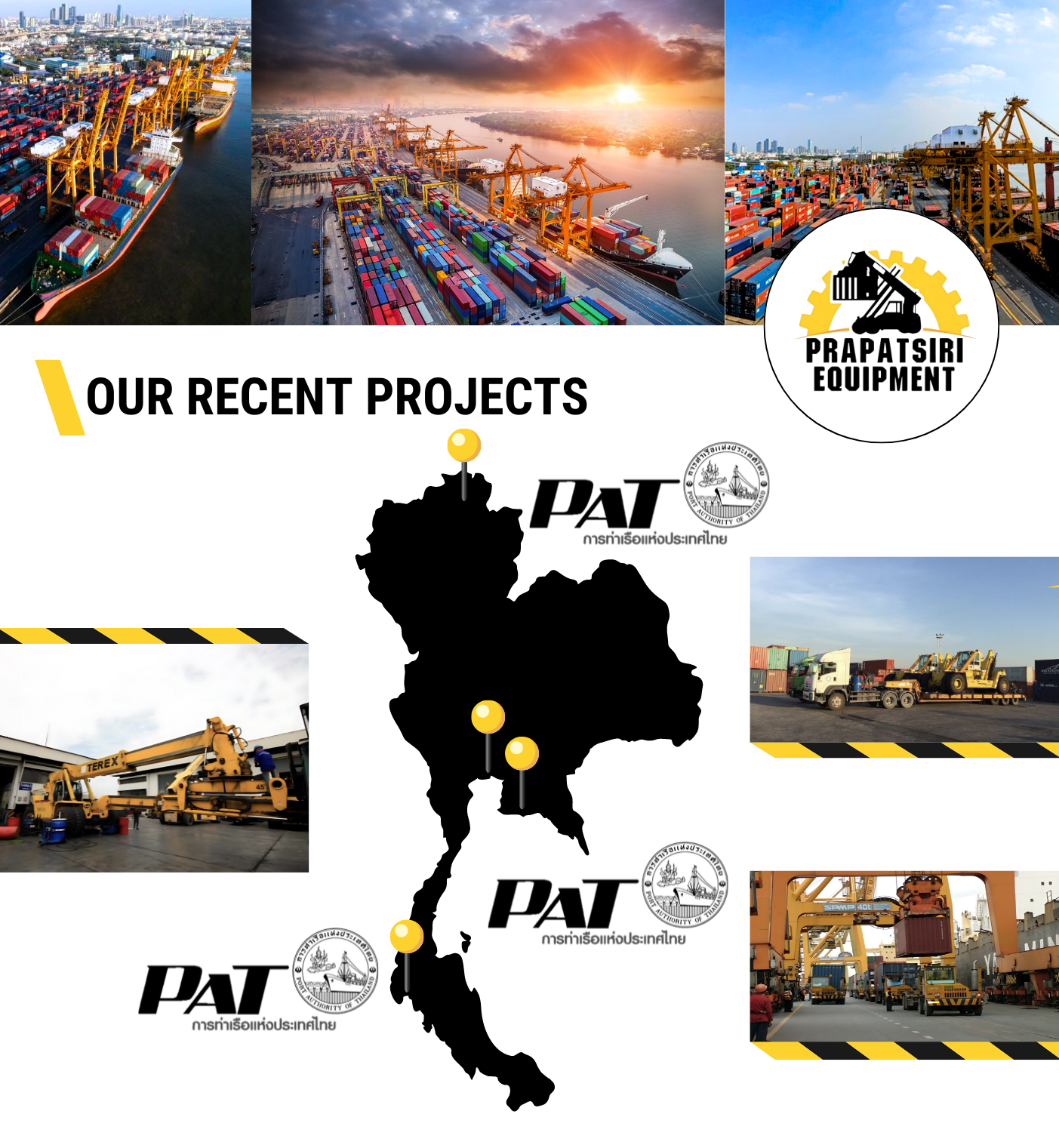 2011-Present | Port Authority of Thailand (PAT) Bangkok | 24/7 Total solution service for 158 yard tractors (Kalmar, Ottawa, Terberg, Capacity) | 2010-Present | Port Authority of Thailand (PAT) Bangkok | Preventive solution (annual contract)- provide monthly check-up services for 26 reach stackers and empty container handling equipment (Terex, Kalmar) | | 2016 | Yusen Logistics (Thailand) | Overhaul Transmission system of Linde Reach Stacker (Rayong site) | 2015 | Port Authority of Thailand (PAT) Ranong | Major restoration of two 40 metric tons reach stackers (Kalmar)and transport them to Ranong port | 2014 | Port Authority of Thailand (PAT) Bangkok | Won the tender- in PAT purchasing 50 metric tons TEREX Rough terrain crane (RT100) | 2014 | Port Authority of Thailand (PAT) Ranong | The Major restoration of one 40 metric tons reach stacker and transport it to Ranong port | | 2013 | Port Authority of Thailand (PAT) Ranong | Transportation of 3 yard tractors, and chassis from Bangkok to Ranong port | 2008 | Port Authority of Thailand (PAT) Chiang Sean | Major restoration of one 50 metric tons rough terrain crane and transport it from Leam Chabang to Chiang Sean Port (Liebherr) |